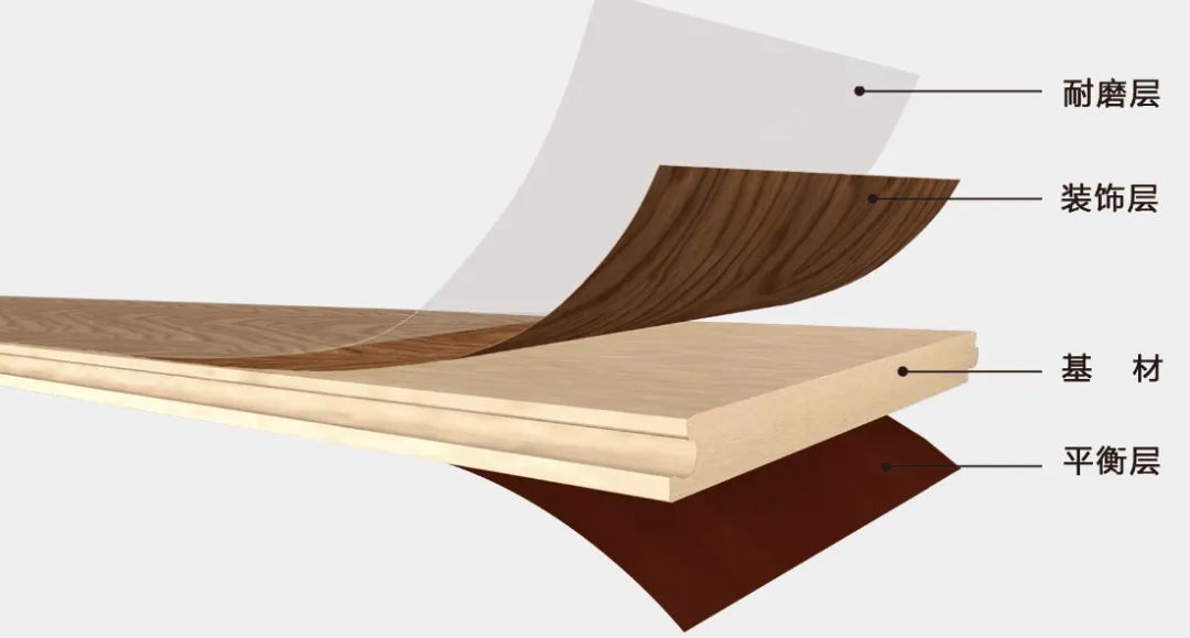強(qiáng)化復(fù)合木地板一般有四層,耐磨層、裝飾層、基材層、平衡層。