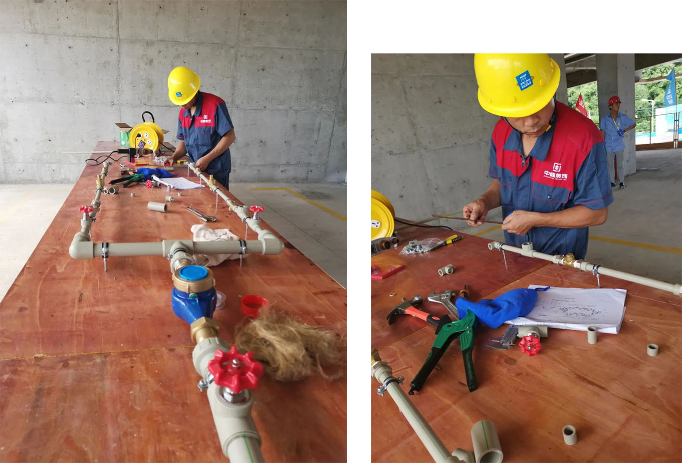 本次比賽從工程部的三個(gè)片區(qū)中精心選出優(yōu)秀水電工,瓦工,膩?zhàn)庸じ魅M,雜工5組,一共32支隊(duì)伍參加本次比賽。